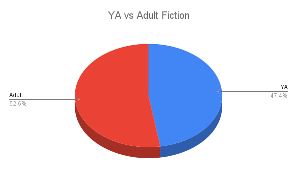 Within the category of fiction, I read slightly more Adult than YA. Given that I write primarily YA right now, I was initially displeased with this result. Then I realized I have better things to do than judge myself for this particular percentage. 😊